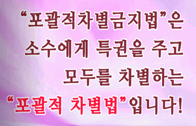 소수자(성·종교·사상)차별금지법은 소수를 보호한다는 용어전술로 다수의 표현의 자유를 제한하는 역차별 악법이다. 절대 반대한다.!!